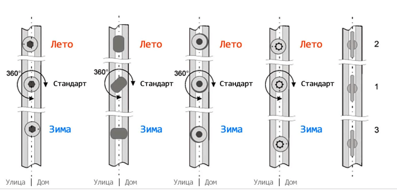 - Зимний режим для максимально плотного прилегания. Чтобы сделать это, каждая цапфа по периметру створок переводится по часовой стрелке на отдаленное положение.