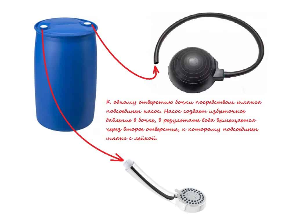 Помпа должна иметь 2 камеры. Шланг, опущенный в емкость, другим концом крепится к насосу. Вторая трубка присоединяется с другой стороны помпы, а на свободный край устанавливается насадка для душа. Эта конструкция наиболее легкая и малогабаритная из предложенных.