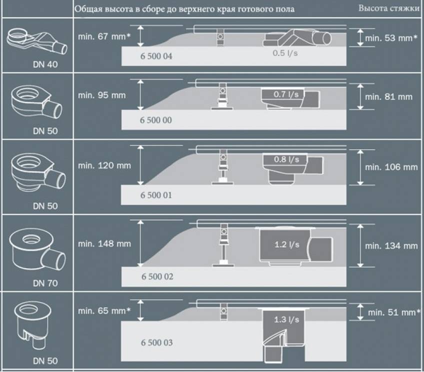 Форма и размеры трапов представлены целой линейкой от различных производителей. От самых простых надежных моделей до сложных конструкций с отсечкой и каскадом обратных сухих и мокрых клапанов. Для удобства разработаны некоторые стандарты по высоте изделия, которая подбирается в зависимости от толщины стяжки пола.