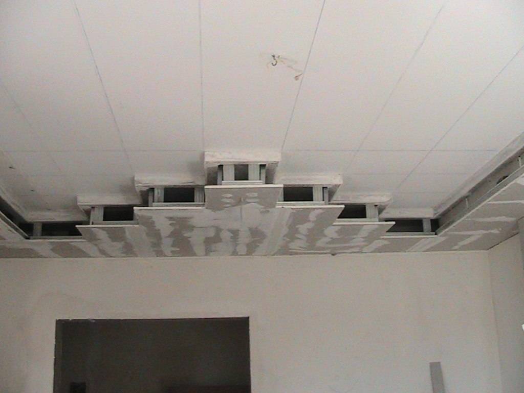 При этом варианте возможно смонтировать короба по стенам, периметру всего помещения, а центр потолка оставить без изменения, только тщательно отштукатурив и прошпаклевав, потому что, при включенных осветительных приборах на потолке будут явственно вырисовываться любые неровности.