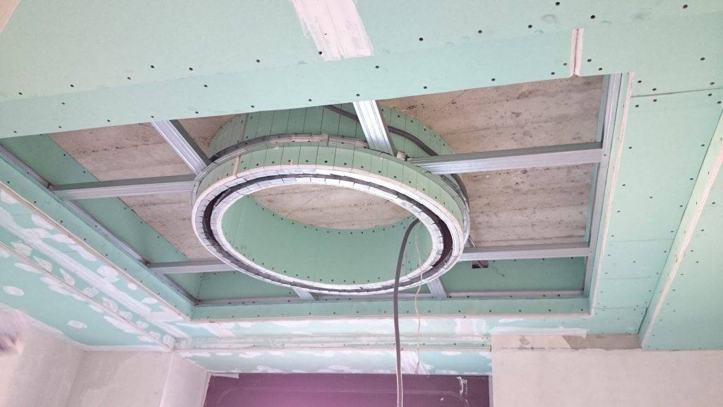 После окончательной фиксации всех частей каркаса, его можно зашивать листами ГКЛ. В тех местах, где будет находится покрытие второго уровня, можно этого не делать – так можно сэкономить и материал, и время.