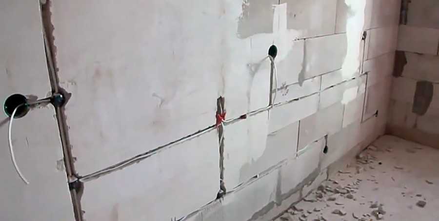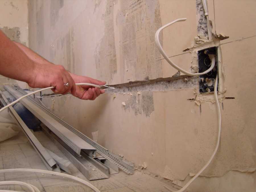 С помощью болгарки, перфоратора на месте прочерченных линий делается штроба, подходящая по размеру для размещения кабелей. Расстояние между каждым должно быть не менее 10 см.