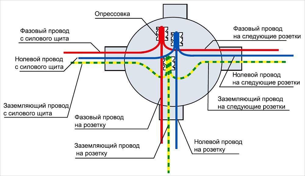 6.Скрутите жилы провода с жилами разводного кабеля в коробке, чтобы нейтраль оказался с нейтралем, фаза с фазой, а заземление с заземлением. А чтобы соединение получилось надежным, на места скруток оденьте гильзы и зажмите их пресс-клещами. Обмотайте гильзы изоляционной лентой ХБ для сухих помещений.