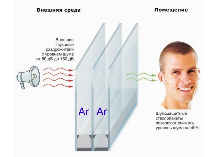 За счет более высокой плотности инертного газа, прохождение звуковой волны через межстекольное пространство будет затруднено, что повышает звукоизоляцию конструкции. Особенно это заметно при установке окон в домах, расположенных вдоль насыщенных городских транспортом трасс.