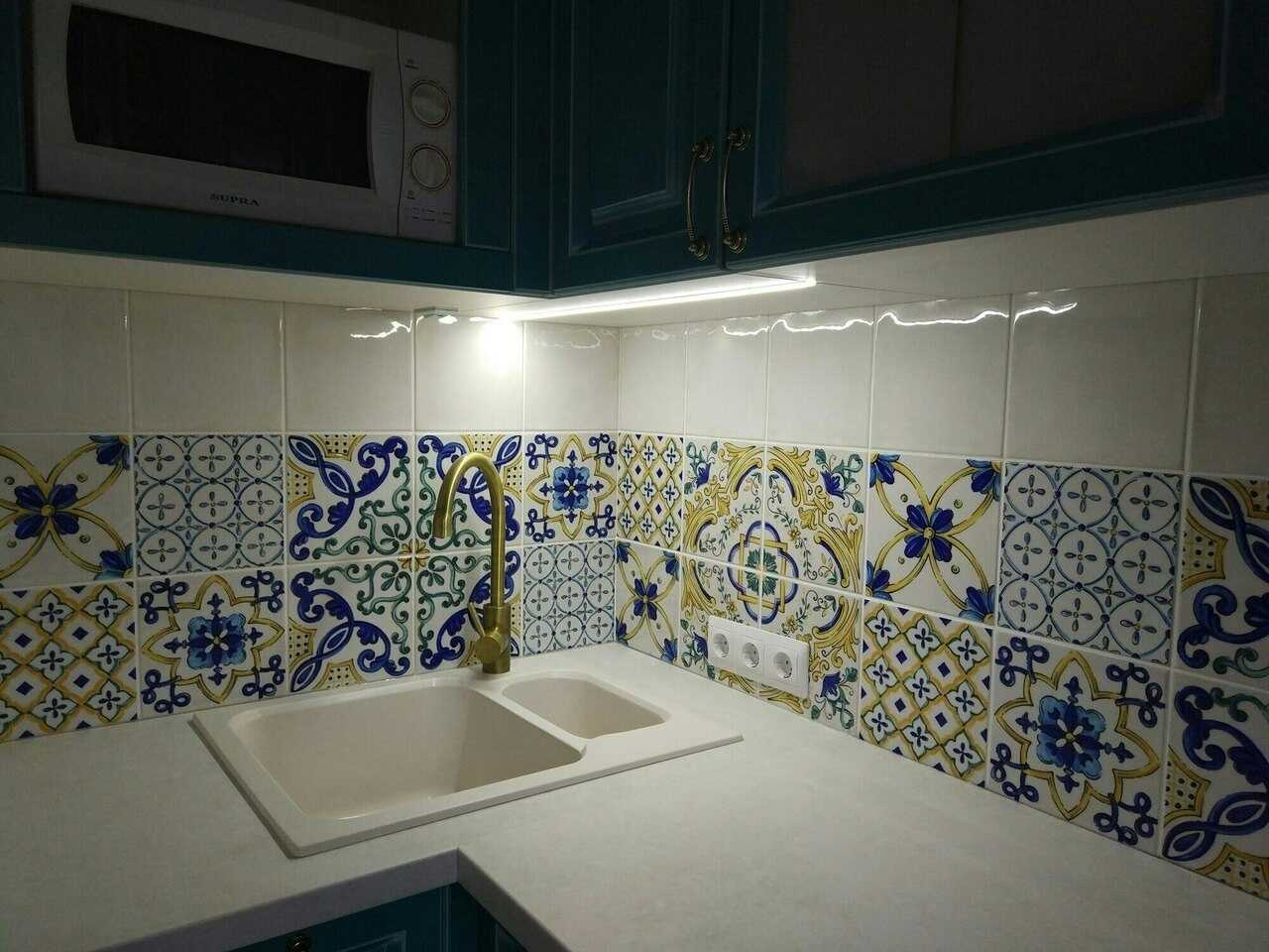 Бывает, что варочная поверхность находится отдельно от основной мебельной группы, либо верхнее пространство между навесными шкафчиками остается не полностью заполненным (при особых проектах индукционных плит или по желанию хозяев). Еще кроме модульных вытяжек в частных домах может применяться каминная система. В этих случаях рекомендуется укладывать полотно фартука вокруг вытяжки и дополнительно защитить прилегающую зону керамической, пластиковой или стеклянной плиткой, которая будет дополнять основной фартук или составит ему красивый контраст в рамках общего дизайна. Плитку кладут по 5-10 см (зависит от ее размера). При использовании иных материалов под вытяжку фартук заходит на 1 см вверх и по 3-4 сбоку.