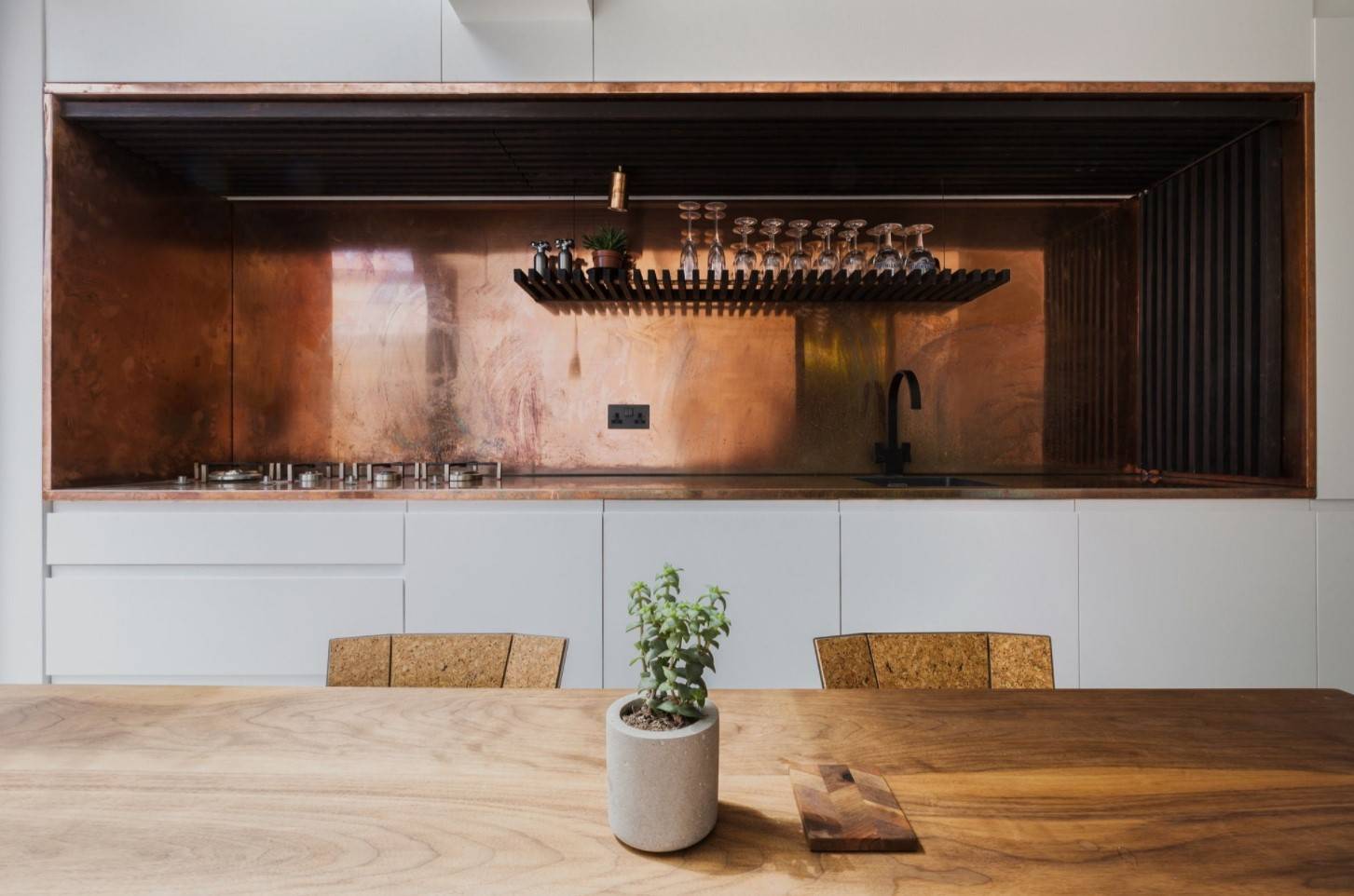 Металлический фартук прочен, не подвержен никаким агрессивным воздействиям, но имеет всего две фактуры — глянцевую и матовую. Он идеально подходит для кухонь в стиле минимализма или хай-тек. К сожалению, в других стилях он будет смотреться не совсем уместно.
