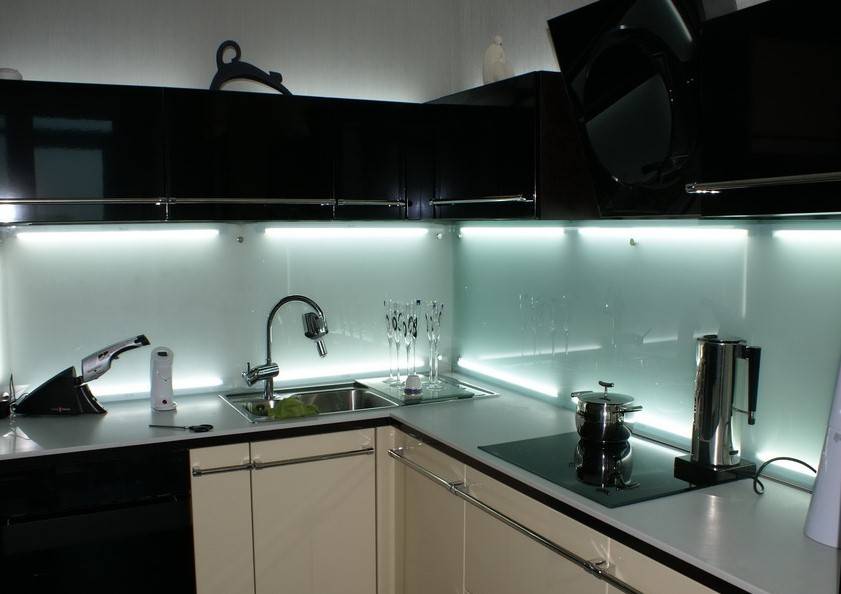 Сочетание стеклянной рабочей зоны с современной лед-подсветкой смотрится очень эффектно.