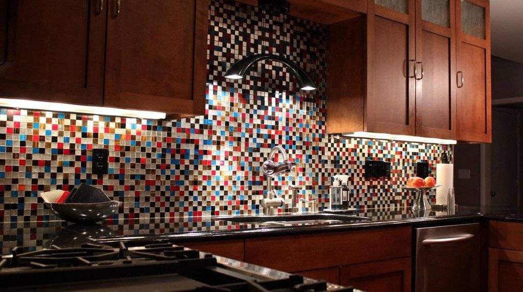 Интересным вариантом оформления кухонного фартука является мозаика. Существует два варианта мозаики для кухонного фартука: