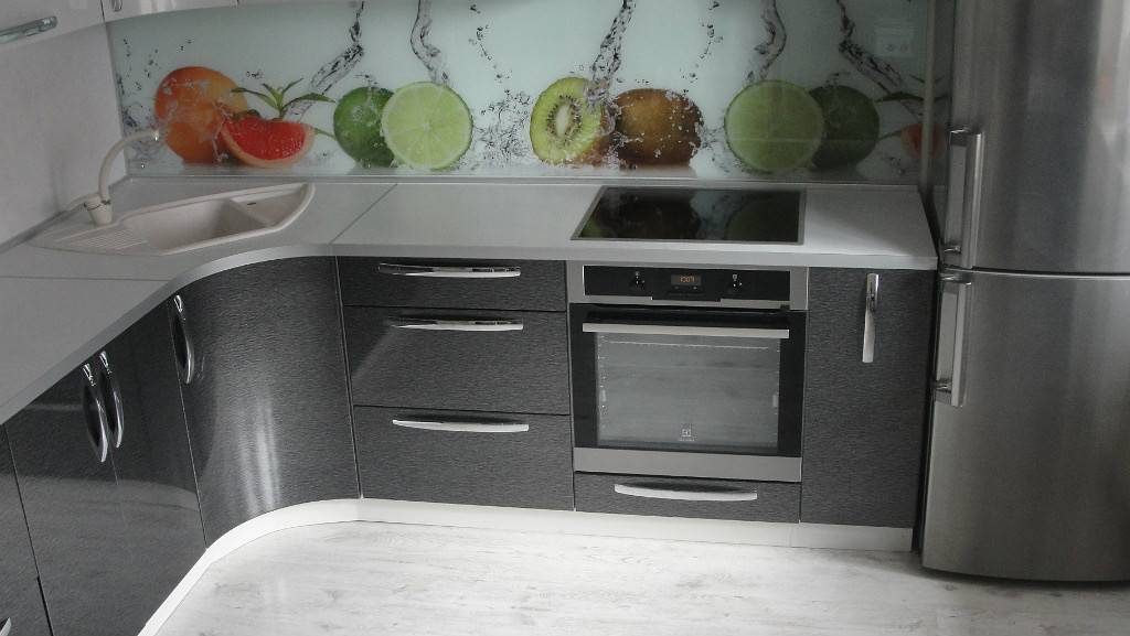 Глянцевый пластик, даже в темном цвете, сделает маленькую кухню неординарной и просторной.