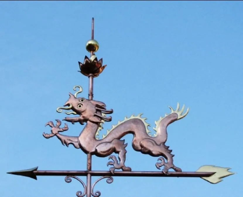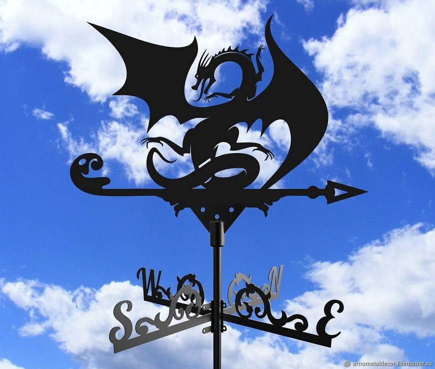 В Европе мифическое животное присутствовало на гербах вельмож и символизировало победу над врагами. В Китае дракон привлекал в дом успех, финансовое благополучие и защищал от болезней. На флюгере западного зверя изображали с крыльями и остроконечным хвостом. Восточный вид напоминал длинного змея с лапами и с жемчужиной в пасти.