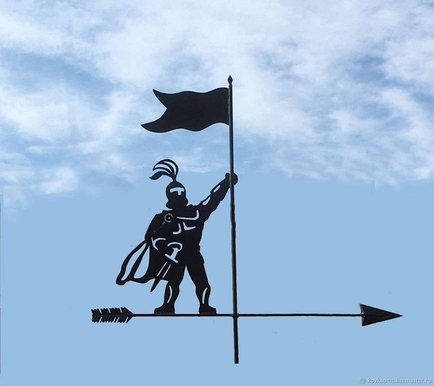 Конструкция флюгера состоит из обязательных деталей. Флажок – запоминающаяся, декоративная часть устройства, которую располагают на вертикальной оси. Чтобы уравновесить флюгарку, с противоположной стороны нужен противовес. Элементы имеют одинаковую массу, поэтому при установке стоят ровно.