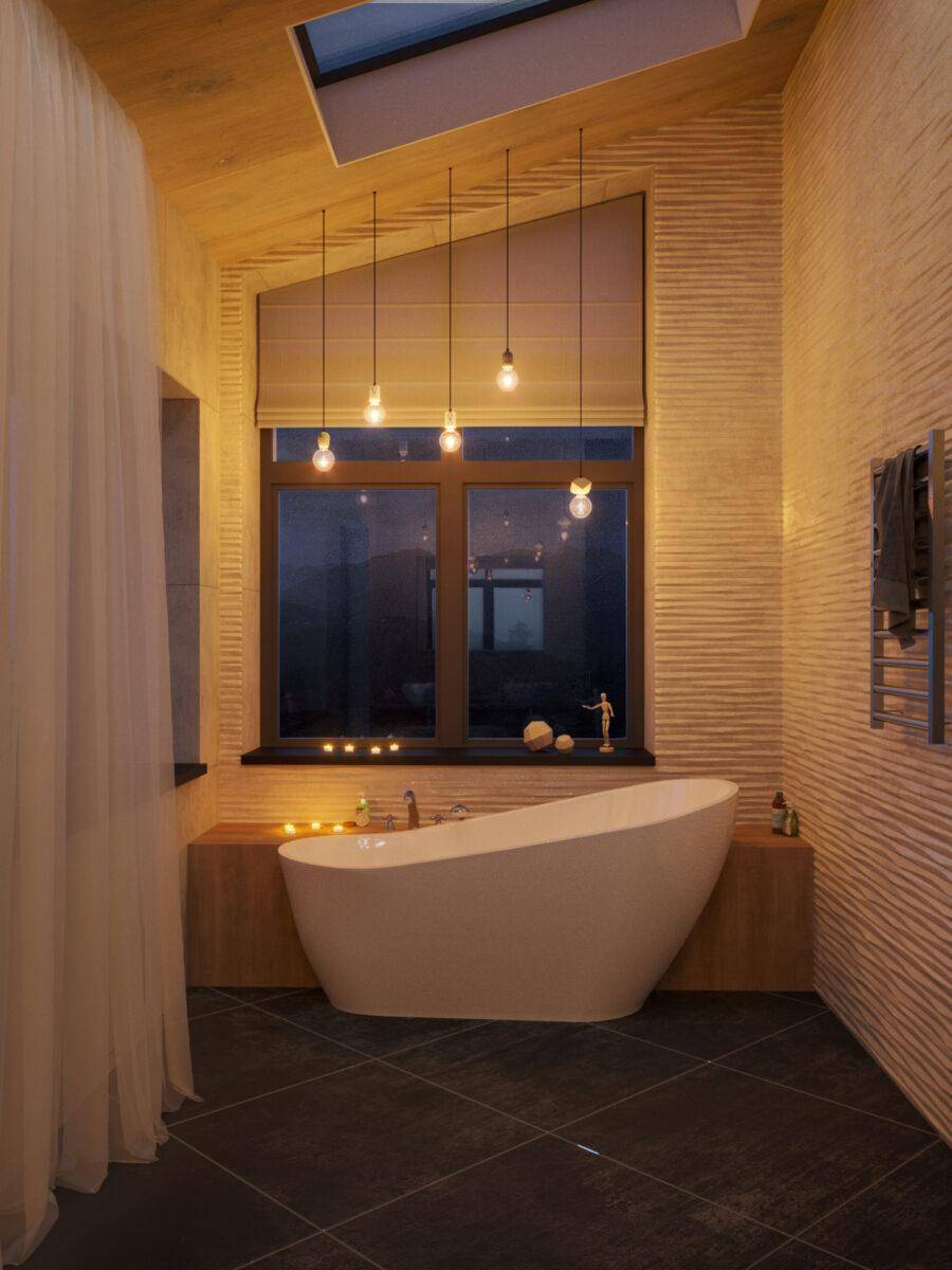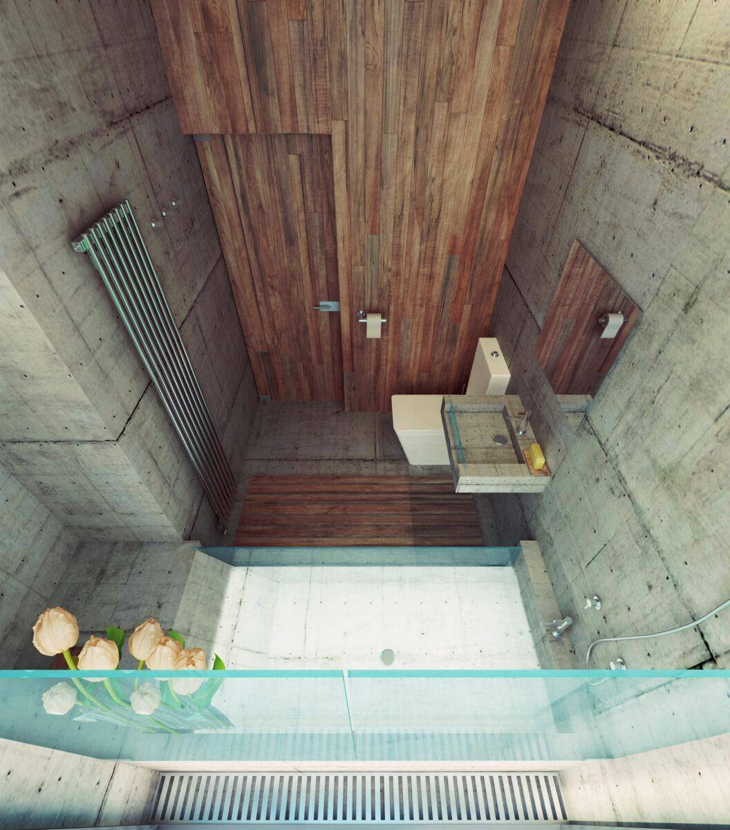 Современный интерьер ванной предполагает использование натуральных материалов, а именной обилие бетонных, каменных и деревянных элементов в дизайне помещения.