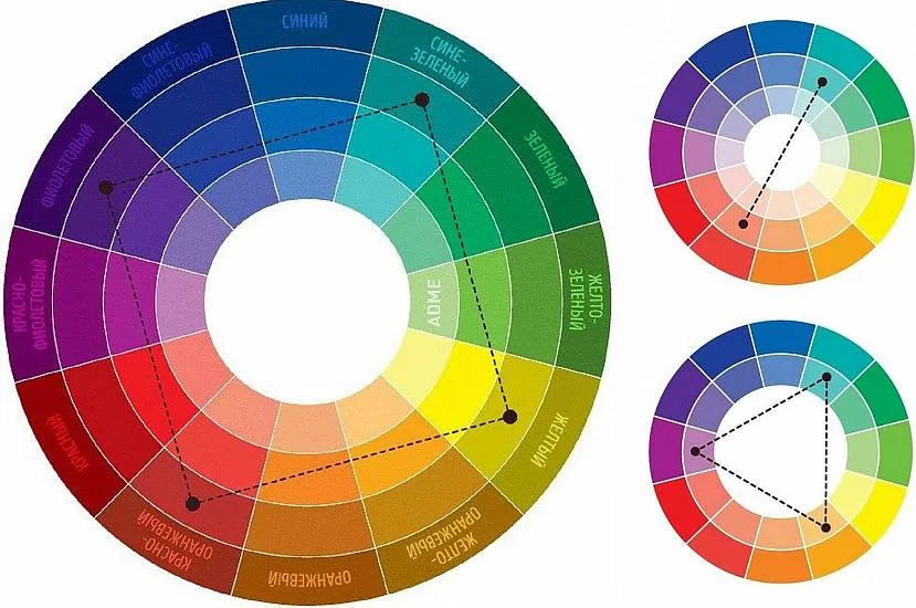 Соединение разных оттенков – смелый и удачный метод, который применяют в помещениях. В пространстве не стоит совмещать более 4 тонов, иначе интерьер станет кричащим и безвкусным. Чтобы не ошибиться с выбором, дизайнеры рекомендуют использовать специальные цветовые круги.