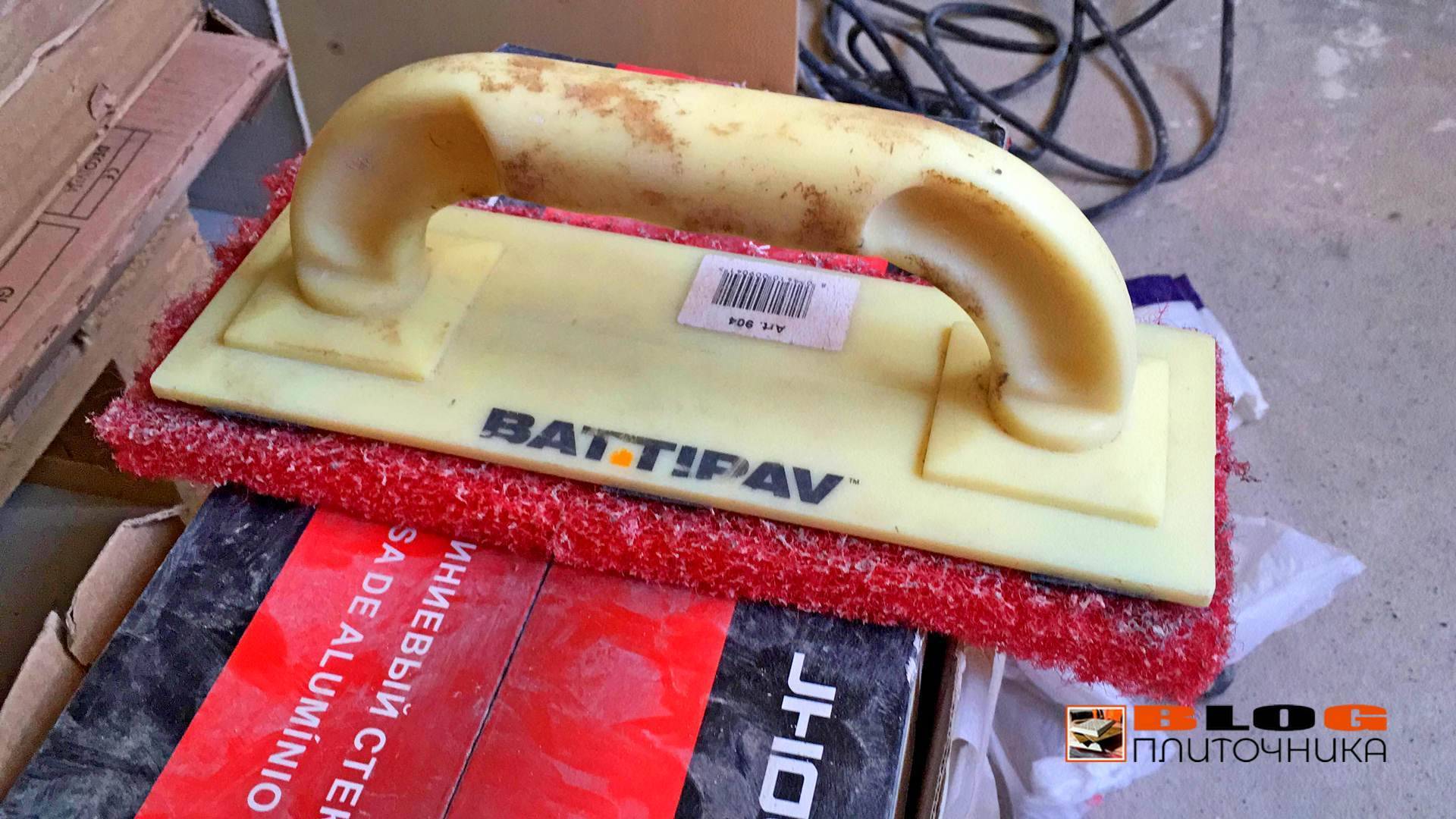Кроме шпателя потребуется поролоновая губка — это второй по важности инструмент при выполнении отделочных работ по кафелю. Влажной губкой удаляют излишки смеси и заглаживают ее поверхность