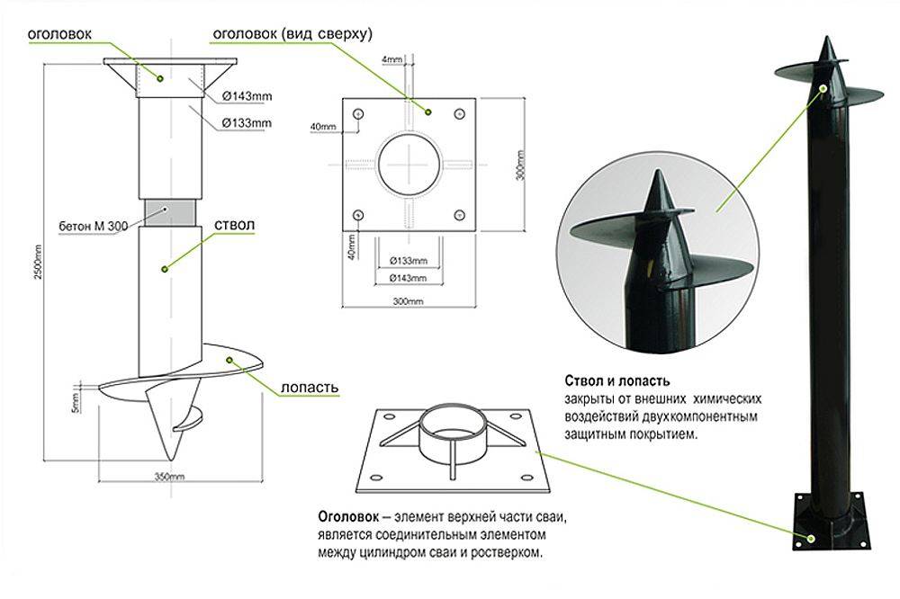 Длина конструкции достигает 6 метров при диаметре 13,3 см. Заканчивается литым наконечником. Стенки толстые и доходят до 4,5 мм. Диаметр лопастей 35 см. Можно выбрать изделие с любым защитным покрытием: горячим цинкованием, на основе акриловой смолы или с двухупаковочной эмали. Отзывы об отечественной продукции только положительные. Производитель гарантирует срок эксплуатации на уровне 100 лет.