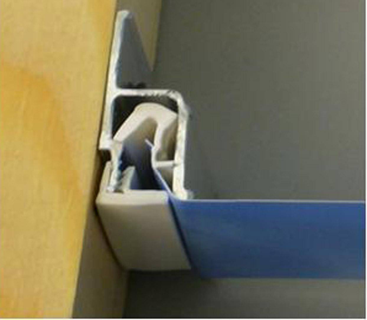 - Гарпун для фиксации полотна в профиле, приваренный к натяжному полотну заводится в багет, внутренний паз которого формой соответствует гарпунной кромке, и закрепляется к нему вместе с полотном, цепляясь за выступ на профиле.