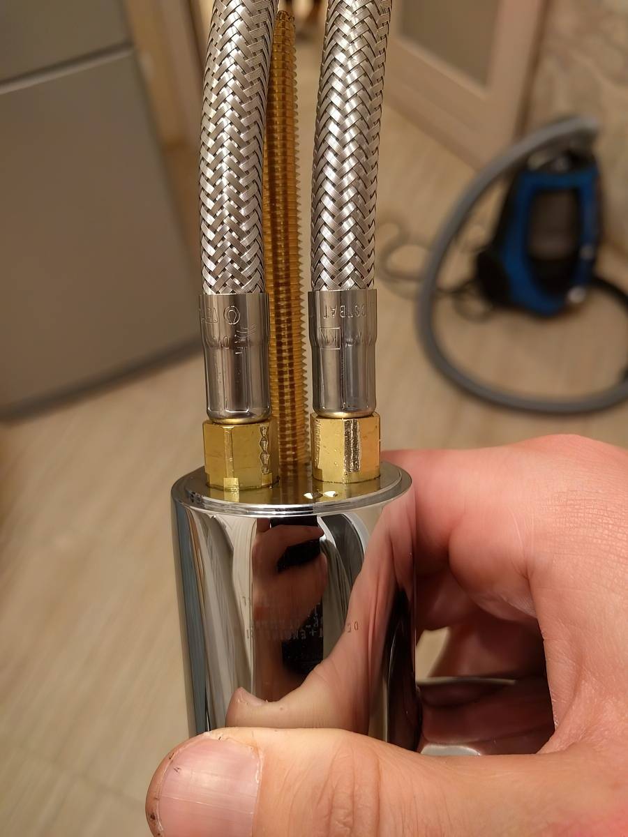 В тех случаях, когда подводка ставится на смеситель, установка начинается с вворачивания штуцера в приемное отверстие с резьбой на корпусе крана.