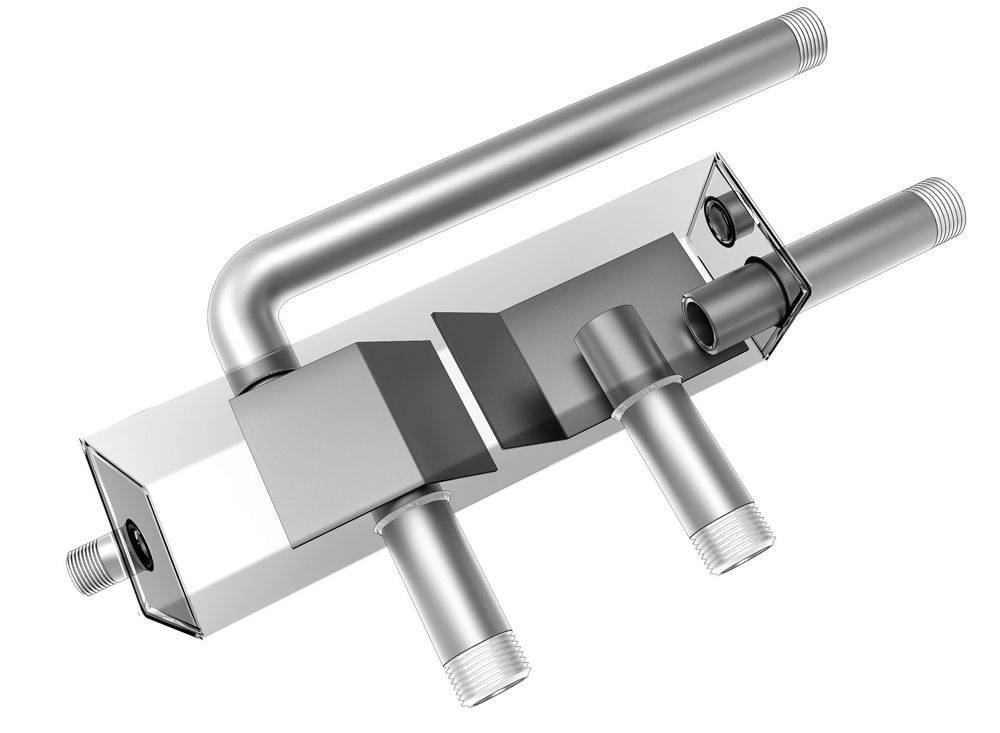 Само устройство походит на вытянутый параллелепипед, с шестью разными выходами, расположенными напротив друг друга. Каждый из этих выходов отвечает за отдельную функцию. Например, самый высокий из 5 клапанов позволяет воздуху беспроблемно выходить из системы, чтобы не повышать всё давление. Это происходит автоматически, владельцу не придётся ничего контролировать.