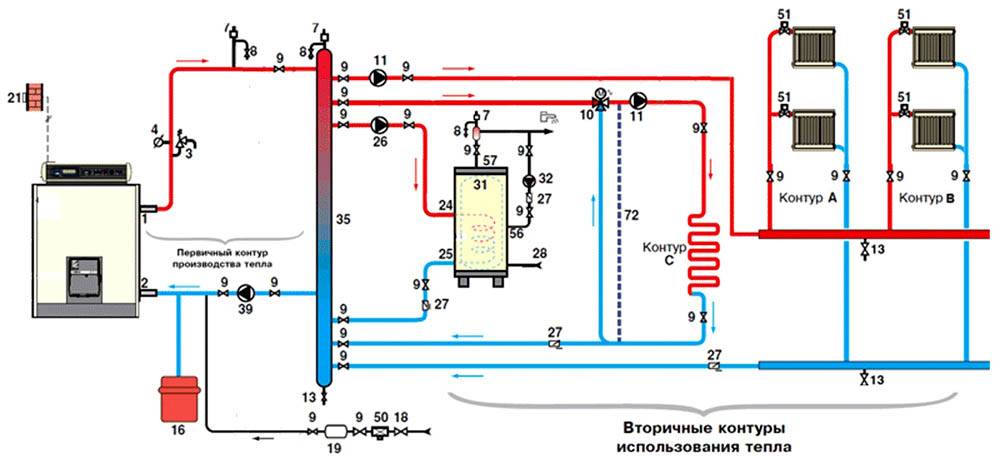 Схема применения гидрострелки в сложной системе отопления
