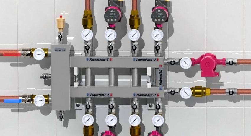 Здесь мы видим, что посредством насоса рабочая жидкость поступает в коллектор, а оттуда уже передается на несколько отопительных контуров. К последним можно отнести следующие элементы.