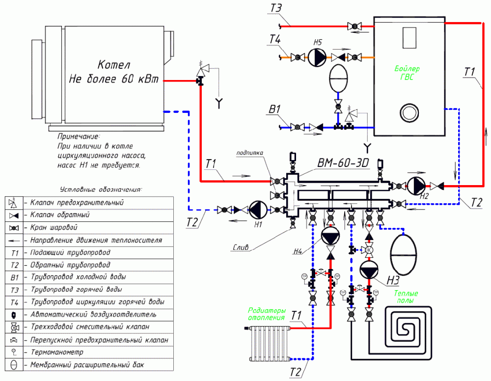 Контур циркуляции котла практически не зависит от вторичного контура, режим работы котла приобретает стабильный, ровный характер. Вторичный контур получает теплоноситель с равной температурой для всех ветвей, необходимое его количество отбирается собственными насосами.