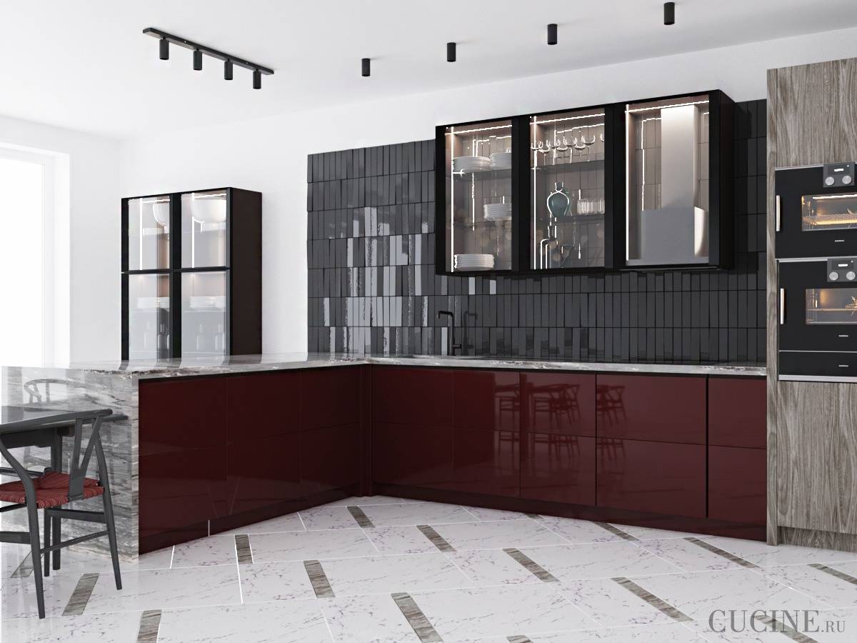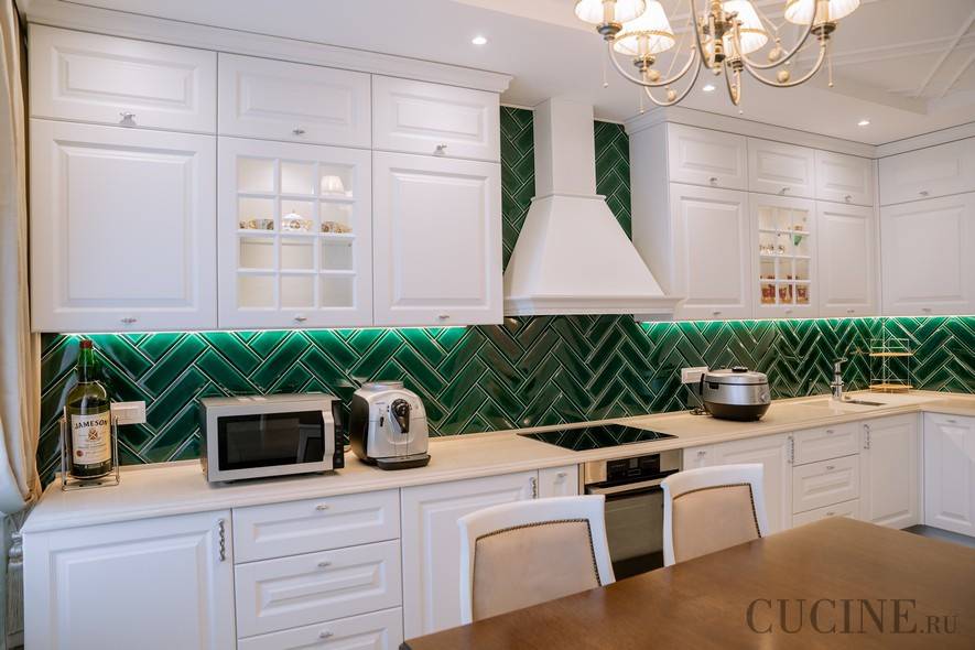 Глазурованная плитка на кухне станет ярким акцентом и поможет защитить рабочую зону от брызг жира, масла и других жидкостей. Фартук может быть стандартным (60 см в высоту), укороченным — бортик 15-20 см от столешницы, а сверху — моющаяся краска или удлиненным — от 1 метра над столешницей до потолка.