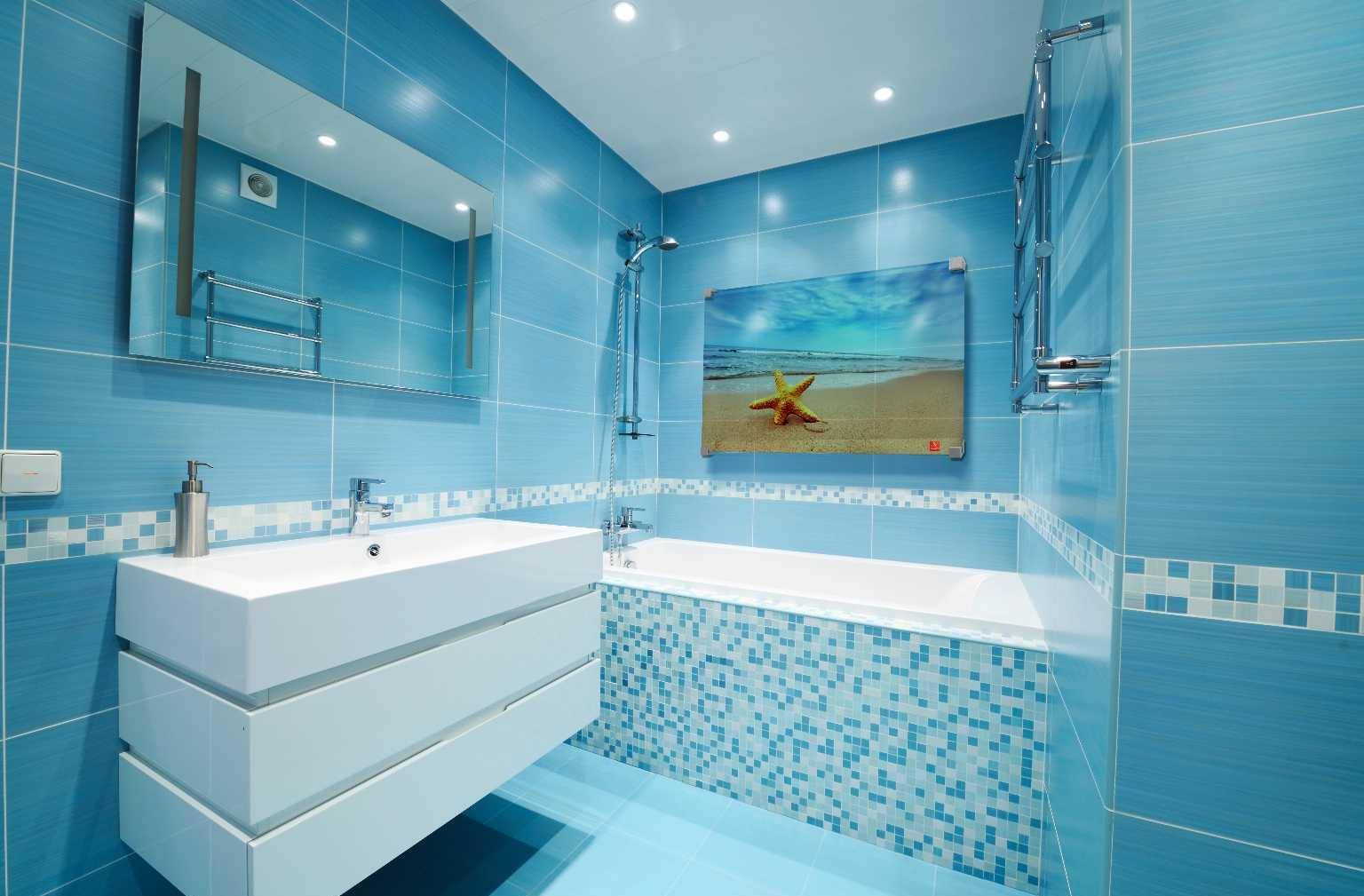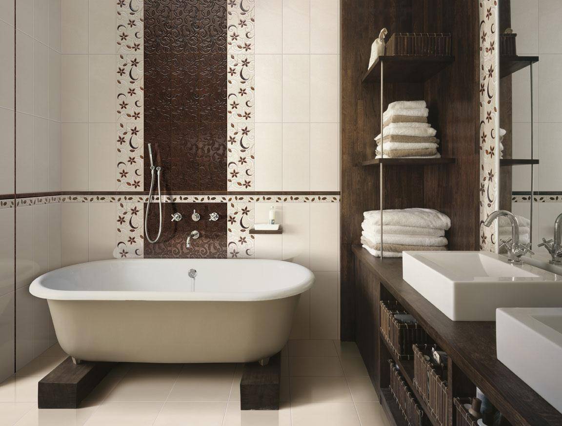 Современно и гармонично будет смотреться размещение на противоположной входу стене фотопанно из плиток. Это придаст помещению нотку изысканности и роскоши. Если в вашей ванной низкие потолки, то зрительно завысить помещение можно, применив горизонтально выложенную плитку.