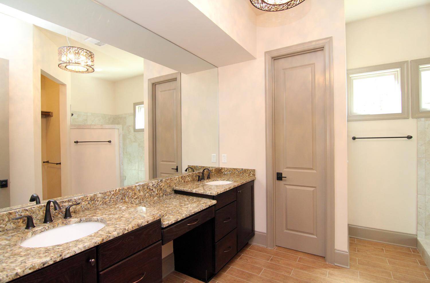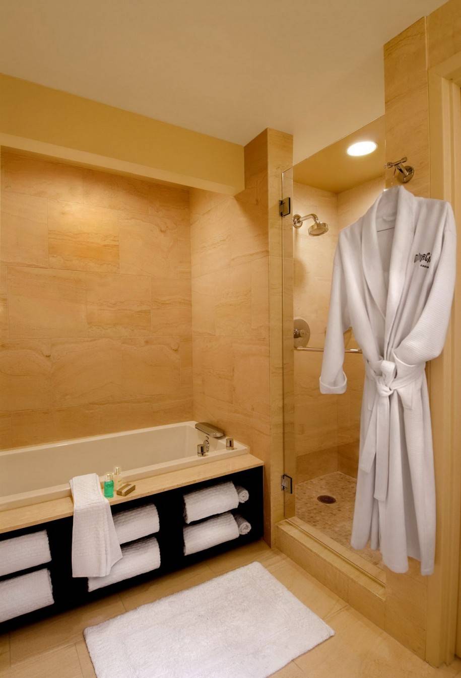 - Зонировать пространство можно не только при помощи освещения, но и с применением многоуровневого пола для акцентирования ванной или другой детали обстановки.