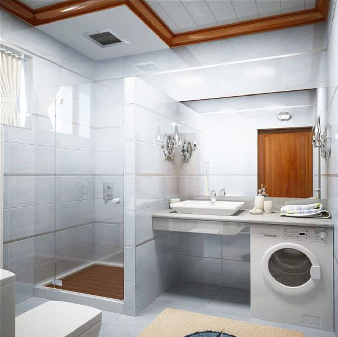 Максимальная загруженность ванной с малым метражом: умывальник, душевая кабина, стиральная машина в малогабаритном размере либо приоритет одного над другим.