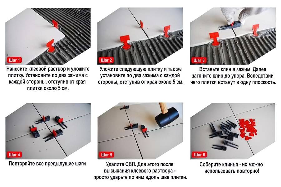 СВП с клинообразными элементами используется в тех случаях, когда поверхность не имеет существенных неровностей. Приспособление с вогнутой формой позволяет добиться самовыравнивания кафеля. Эта система позволяет подстраиваться под существующие условия и создать ровную поверхность благодаря равномерному распределению клея.