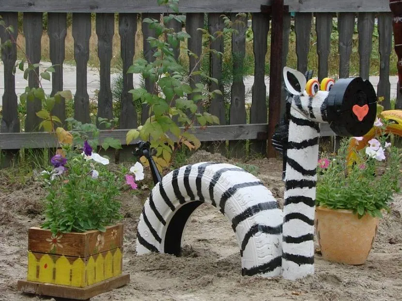 Хорошей идеей оформления сада станет использование автомобильных шин, тем более, что их можно разрисовать всеми цветами радуги, уложить в несколько слоев, создав миниатюрное подобие природной террасы. Отлично и пока не совсем обычно смотрятся горизонтальные и вертикальные подвесные клумбочки из этого ненужного материала.