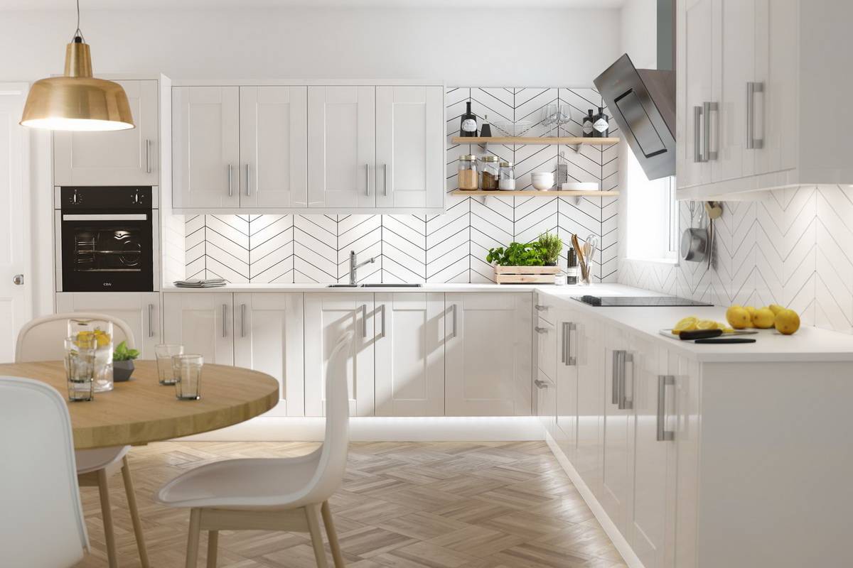 Стильно смотрится молочный или черно-белый интерьер в такой кухне. К основному светлому тону можно добавить несколько ярких акцентов. Как пример, красочные жалюзи или декорированная столешница.