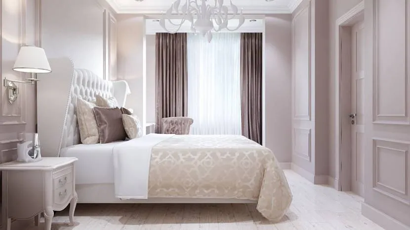 Спальням в классическом стиле подойдет светлая мебель, оттенка ванили или кофе с молоком, желательно с золотой отделкой. Для более простых современных направлений выбирайте белую мебель: она не привлекает лишнего внимания, сочетается с любыми тонами, всегда выглядит уместно.