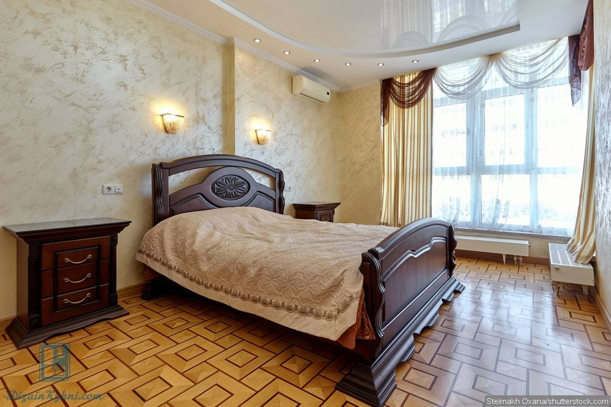 Классическим вариантом для такой спальни является светлый натяжной потолок. Кто-то отдает предпочтение оштукатуренному потолку. На нем изящно может смотреться аккуратная лепнина. Но такой потолок нуждается в регулярном обновлении, так как на нем могут возникать трещины, осыпание штукатурки. Потолок темного цвета следует делать только в том случае, если вы уверены, что он идеально впишется в общий дизайн помещения.