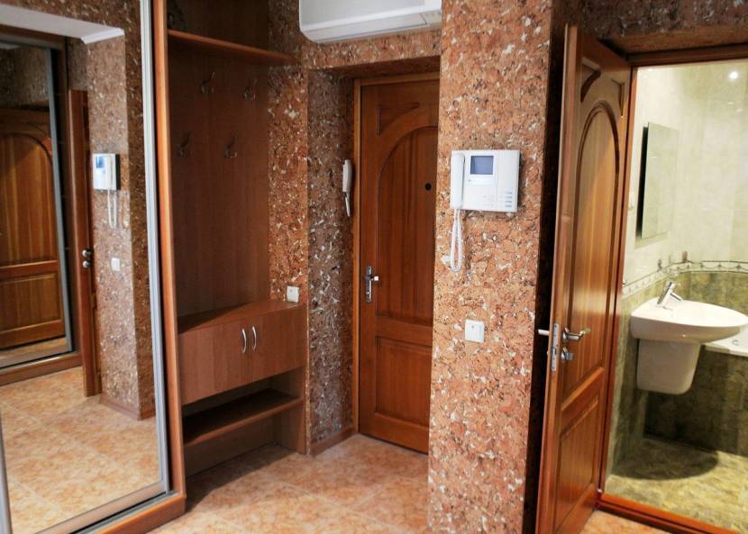 Отделка прихожей декоративным камнем тоже вполне подвластна простым смертным, т.к. по технологии мало чем отличается от укладки кафеля. На цементный раствор или клеевой состав облицовочные элементы крепятся либо бесшовно (создавая имитацию цельной поверхности), либо с расшивкой швов (на расстоянии около 1.5-2 см друг от друга).