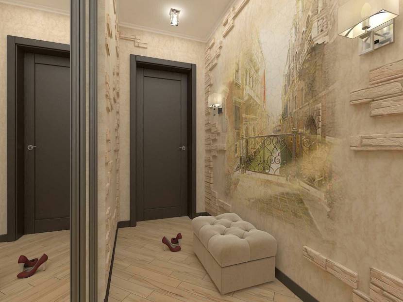 Если коридор расположен в центральной части квартиры, то каменные полы могут быть совсем неактуальны. В этом случае декоративный материал можно использовать для облицовки стен. Красиво смотрится имитация кирпичной кладки