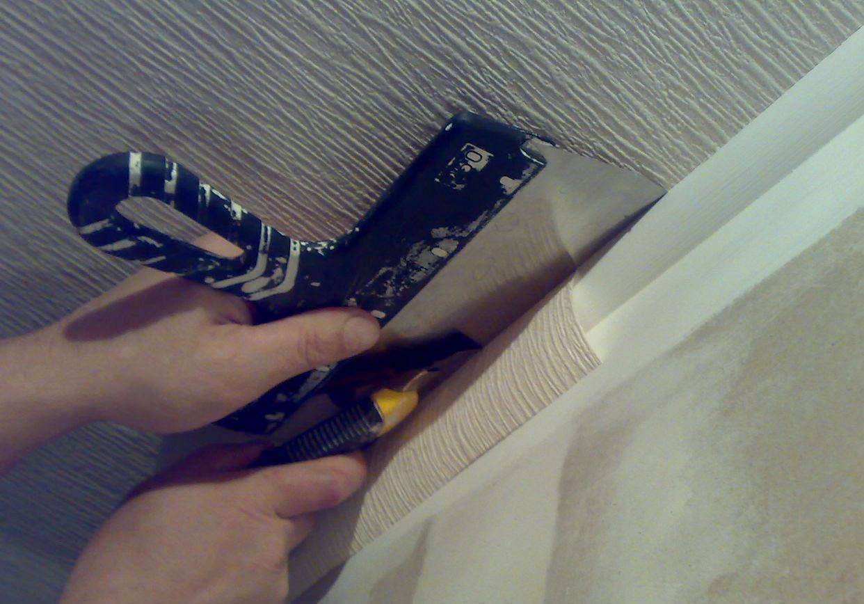 - Заправляют полотно в багет шпателем при участии помощника. Начинают работу с одной стороны, после чего переходят к противоположной. Лишнее полотно обрезают острым ножом.