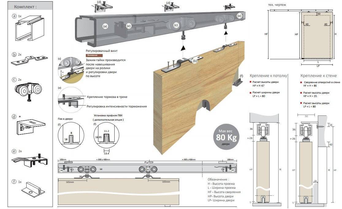 Система навесных дверных полотен состоит из особой конструкции направляющего рельса и роликов.