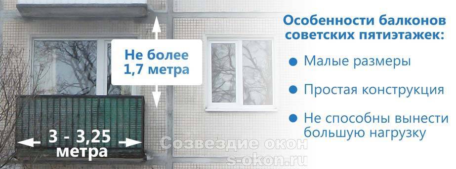 В типовых домах, ставших символами 50-80-х годов прошлого столетия, балконы и лоджии были «серийными». В те времена проектные институты разрабатывали эскизы будущих строений по стандартам. Тогда и появилось понятие «стандартная ширина балкона».