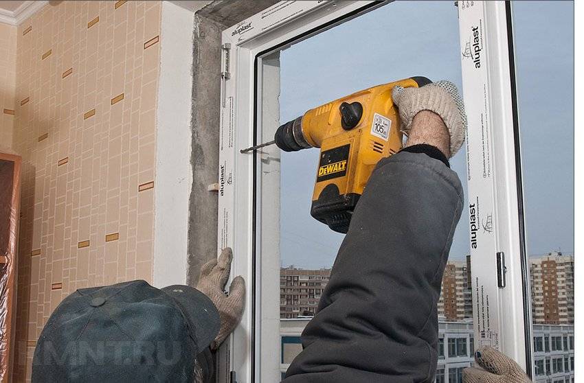 Снимите окно и просверлите с помощью перфоратора отверстия под анкеры в стене.