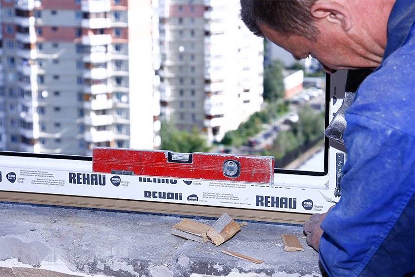Выровняйте конструкцию по трем осям: вертикально и горизонтально в плоскости окна и вертикальность в плоскости, перпендикулярной оконному проему.