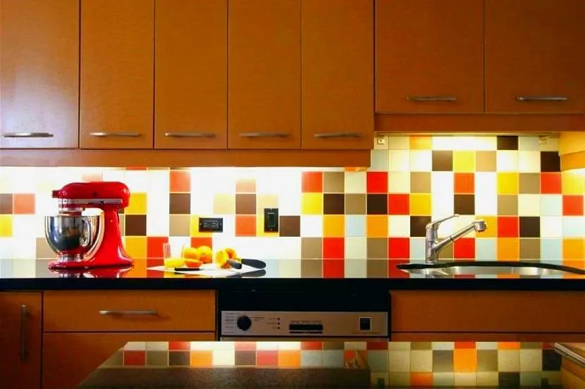На фото рабочая зона на кухне оформлена вставками из цветных изразцов.