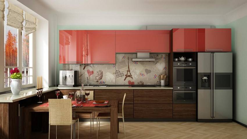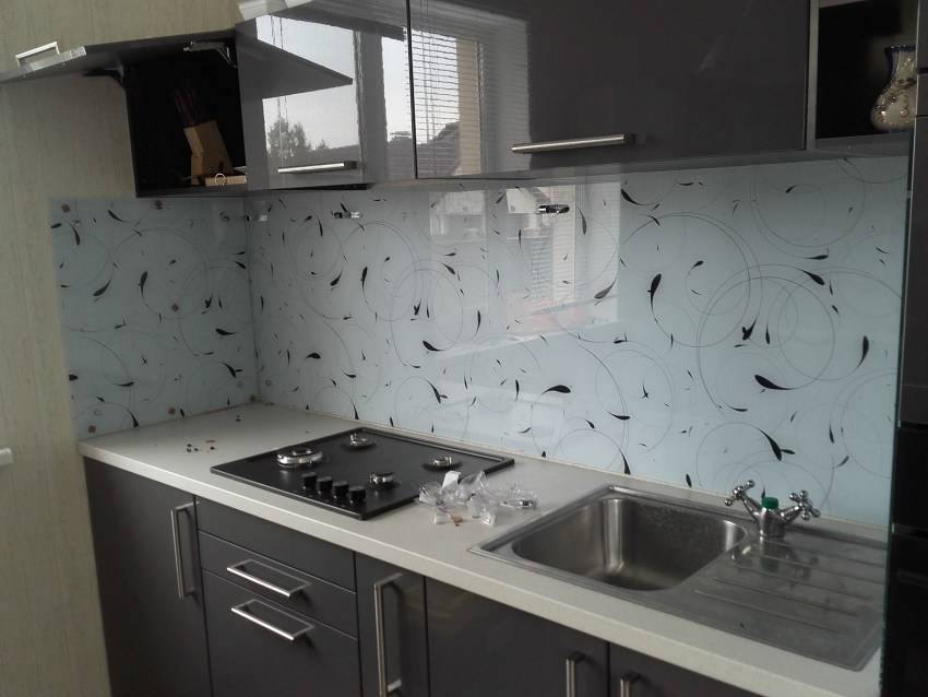 Длина облицовки, как правило, равна длине всего гарнитура, но в целях экономии можно закрыть только участки стены над мойкой и варочной поверхностью.
