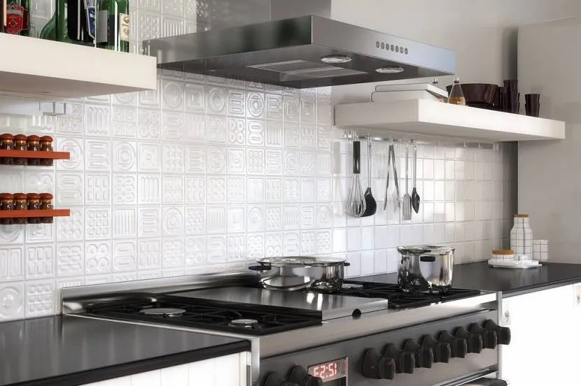 Необычные изделия – ромбы, многоугольники и особенно плиточки неправильной формы – позволяют сложить причудливые геометрические орнаменты и сделать фартук изюминкой кухни.