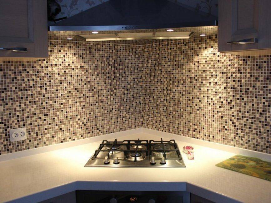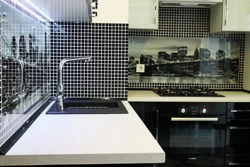 В качестве облицовки эффектно смотрится зеркальная мозаика, которая усложняет и расширяет пространство. Для маленьких кухонь – отличный выбор, но только в том случае, если столешница не перегружена предметами.