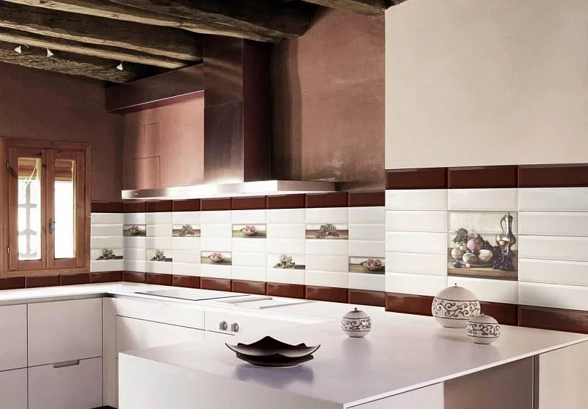 Кухонная плитка с большим количеством элементов понравится любителям ретро. Материал использовался хороший, поэтому небольшие повреждения и воздействие бытовой химии он выдержит без особых проблем. Подойдет для облицовки кухонного фартука и ванной комнаты, что также добавляет ему преимущества. Гармонично смотрится вместе с некоторыми современными решениями.