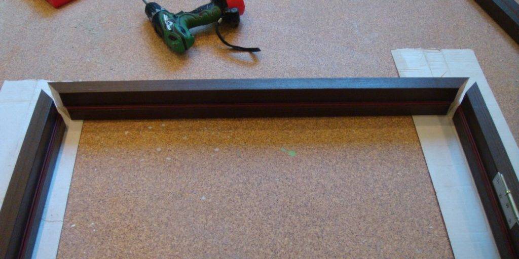 Прикручиваем саморезами под углом 45о добор к коробке.