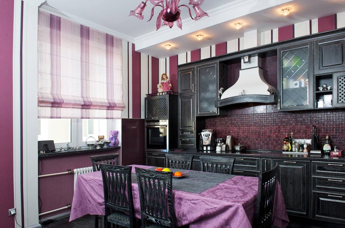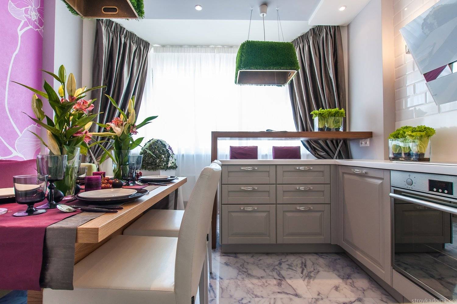 Красивым решением для оформления кухонного окна будут сиреневые шторы. Они могут быть с цветочным орнаментом или абстрактными узорами. Привлекательно смотрятся сиреневые короткие портьеры. Цвет имеет несколько оттенков, для кухни лучше выбрать спокойные холодные тона. Также могут быть длинные занавески в стиле кисеи, которые гармонично будут смотреться со светлыми стенами.