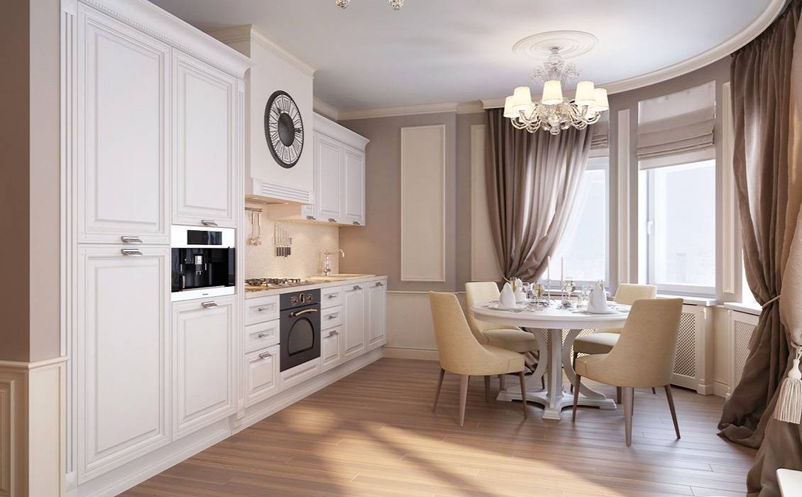 Плотные шторы с ламбрекеном из дорогой ткани будет уместны на кухне в классическом стиле