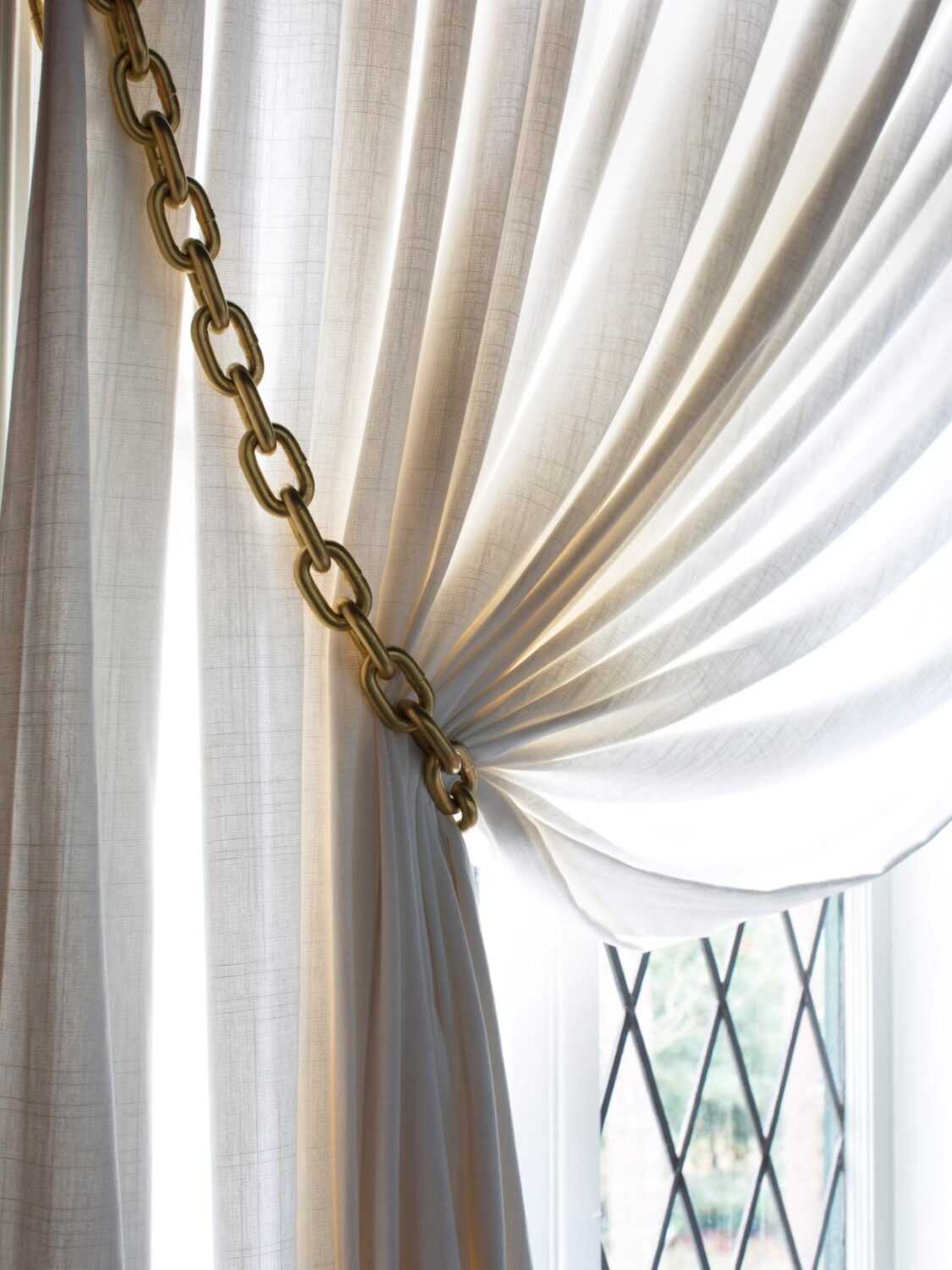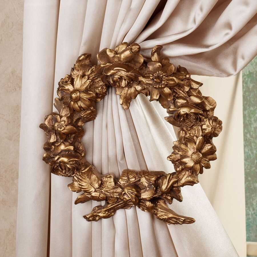 Важно! Для занавесок, лежащих на полу, декоративных деталей должно быть минимальное количество. А вот коротким шторкам наоборот, необходимы вспомогательные аксессуары
